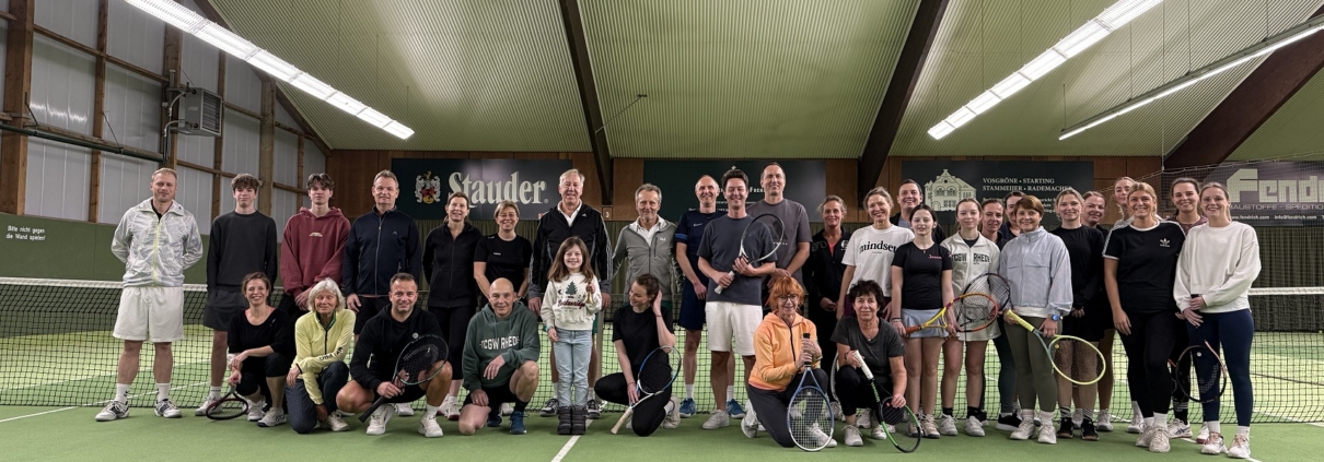 Knapp 40 Mitglieder konnte Sportwart Felix Schneider am vergangenen Sonntag (23.11.2025) in der Tennishalle begrüßen. Sehr viele „Newcomer“ haben das Angebot angenommen, um sich beim Spielen mit der gelben Filzkugel und in dem Gastraum bei Kaffee und Kuchen kennenzulernen. Gespielt wurde im Doppel-Schleifchen-Modus mit und gegen stets verschiedenen Partnern. Jeder durfte 3 x 30 Minuten auf dem Court den Schläger schwingen. Die Zusammenstellung der Doppel war so gewählt, dass jeweils ein Newcomer mit einem erfahreneren Spieler spielen konnte. Nach vier Stunden konnten Angela Wülfing, Newcomer Jan Rohdewald und Petra Niehaus jeweils drei Siege für sich verbuchen. Neben einem Jubiläums-Käppi für die drei Erstplatzierten gab es für alle Beteiligten ein Paar TC GW Rhede Jubiläums-Tennissocken.