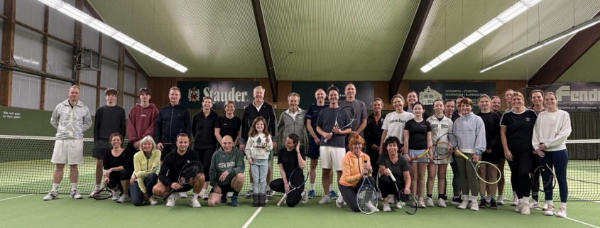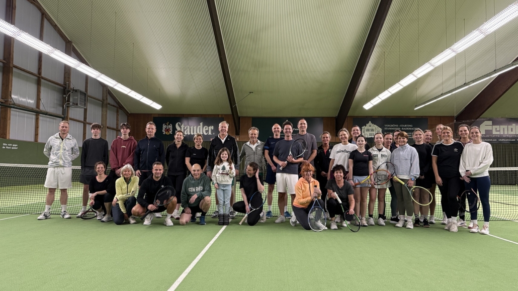Knapp 40 Mitglieder konnte Sportwart Felix Schneider am vergangenen Sonntag (23.11.2025) in der Tennishalle begrüßen. Sehr viele „Newcomer“ haben das Angebot angenommen, um sich beim Spielen mit der gelben Filzkugel und in dem Gastraum bei Kaffee und Kuchen kennenzulernen. Gespielt wurde im Doppel-Schleifchen-Modus mit und gegen stets verschiedenen Partnern. Jeder durfte 3 x 30 Minuten auf dem Court den Schläger schwingen. Die Zusammenstellung der Doppel war so gewählt, dass jeweils ein Newcomer mit einem erfahreneren Spieler spielen konnte. Nach vier Stunden konnten Angela Wülfing, Newcomer Jan Rohdewald und Petra Niehaus jeweils drei Siege für sich verbuchen. Neben einem Jubiläums-Käppi für die drei Erstplatzierten gab es für alle Beteiligten ein Paar TC GW Rhede Jubiläums-Tennissocken.